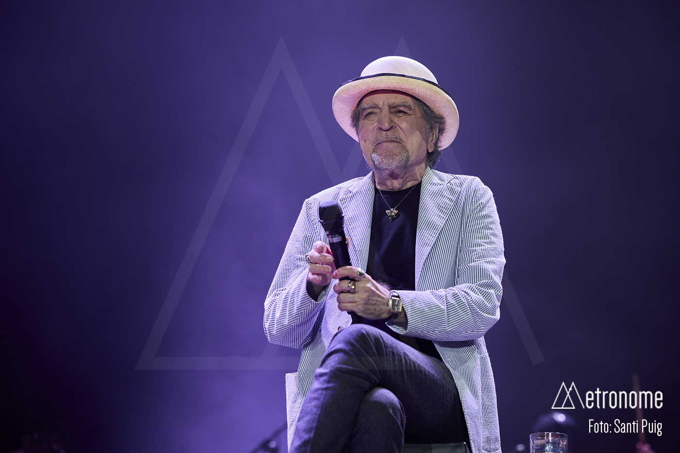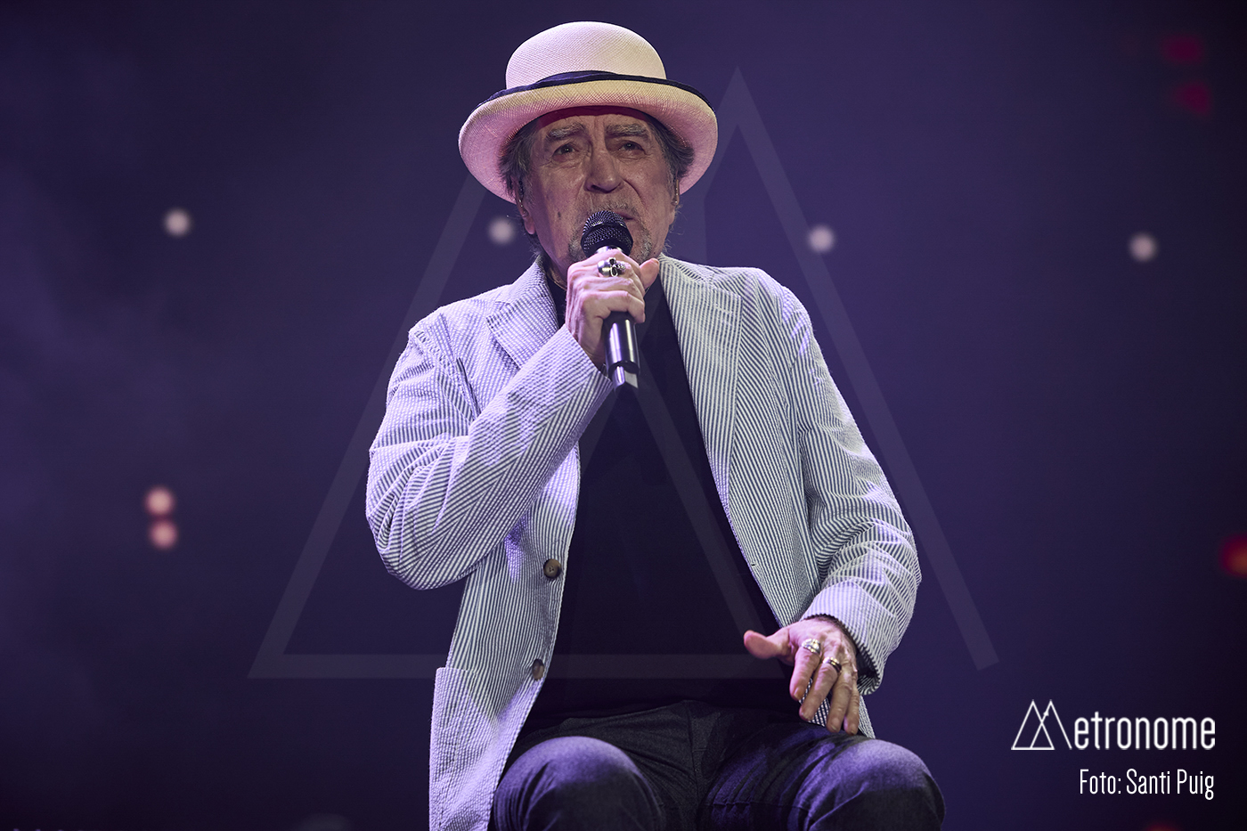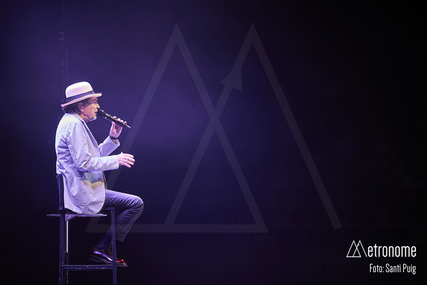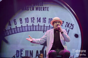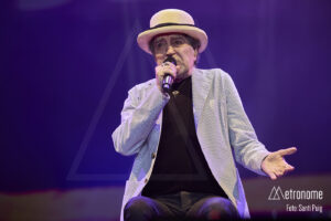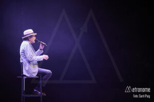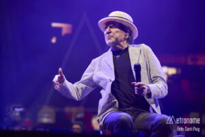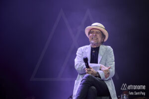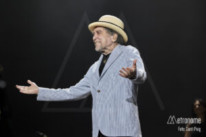 Cuando por fin se apagaron las luces, Sabina apareció lentamente, con esa fragilidad tan suya, saludando con una reverencia a los presentes para sentarse en un taburete en el centro del escenario. Desde el primer acorde quedó claro que el suyo iba a ser un concierto íntimo, de confesión más que de espectáculo. El propio Sabina se encargó de situar la velada en contexto: recordó con cariño su relación con Cataluña, mencionó al “Noi de Poble Sec” un Joan Manel Serrat presente entre la multitud que llenaba el Sant Jordi y sus “Paraules d’Amor”, y a quien, por cierto, dedicó el tema “Calle Melancolía” y evocó a “L’home del carrer” Quico Pi de la Serra y a Ovidi Montllor con su “Homentatge a Teresa” con esa añoranza de haber podido disfrutar de canciones compartidas.