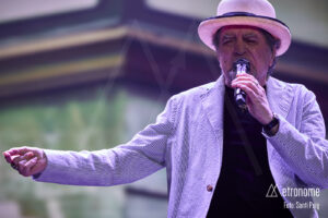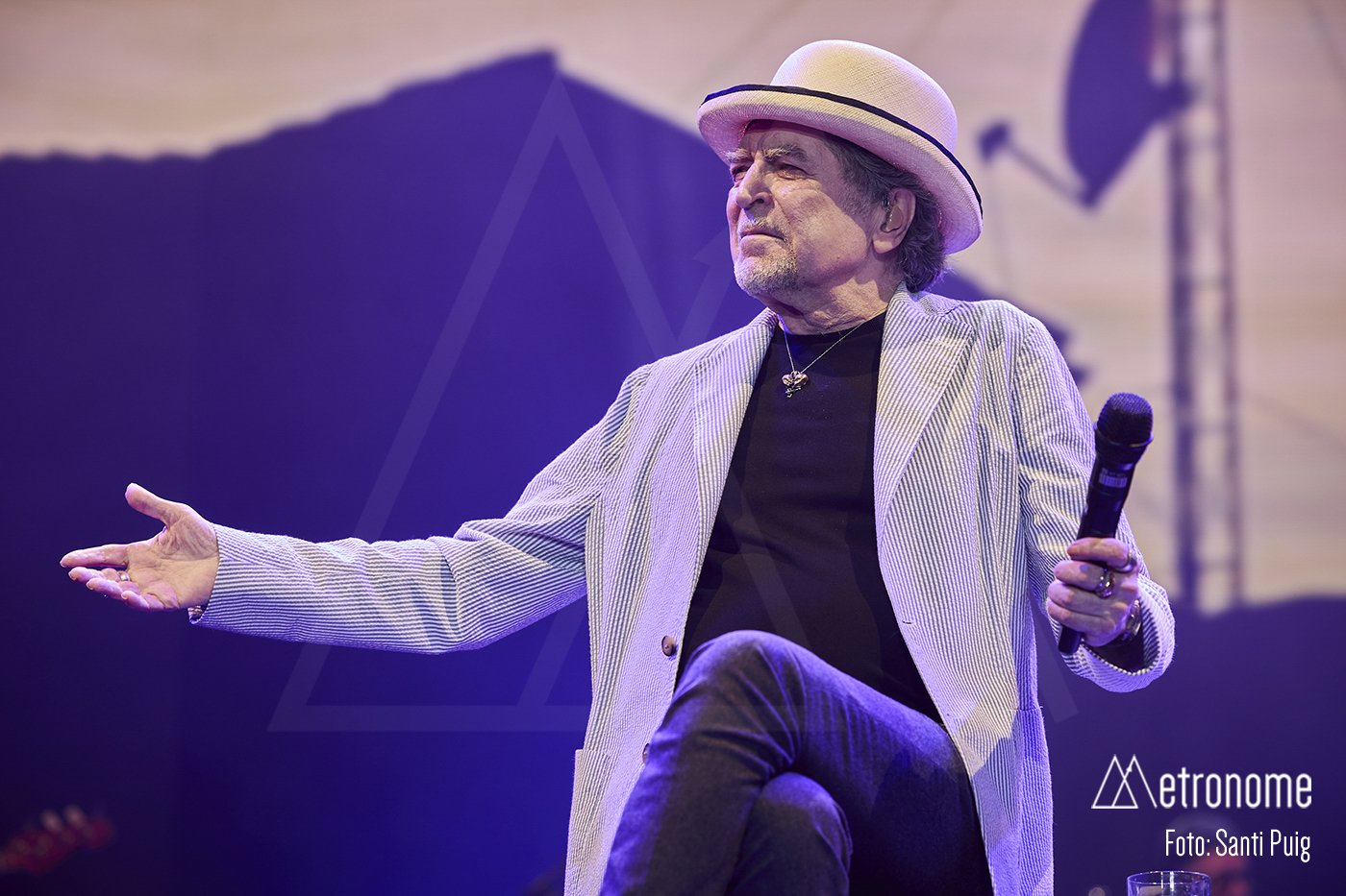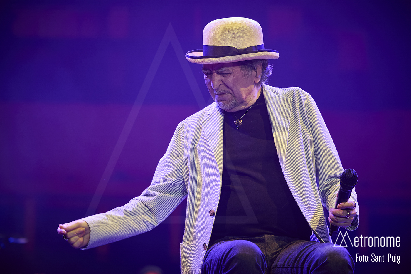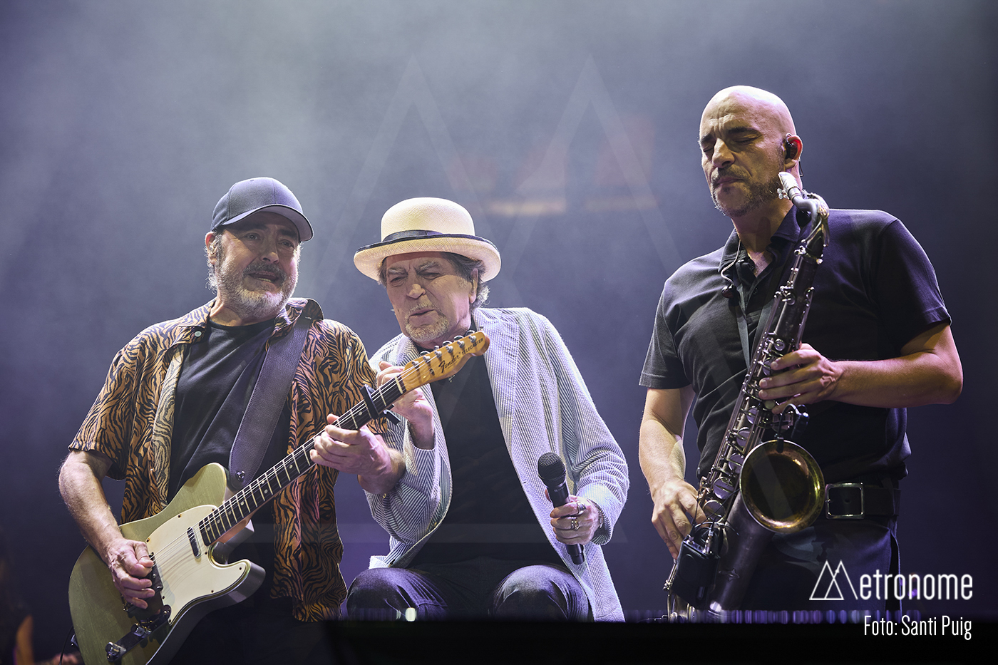 Cuando por fin se apagaron las luces, Sabina apareció lentamente, con esa fragilidad tan suya, saludando con una reverencia a los presentes para sentarse en un taburete en el centro del escenario. Desde el primer acorde quedó claro que el suyo iba a ser un concierto íntimo, de confesión más que de espectáculo. El propio Sabina se encargó de situar la velada en contexto: recordó con cariño su relación con Cataluña, mencionó al “Noi de Poble Sec” un Joan Manel Serrat presente entre la multitud que llenaba el Sant Jordi y sus “Paraules d’Amor”, y a quien, por cierto, dedicó el tema “Calle Melancolía” y evocó a “L’home del carrer” Quico Pi de la Serra y a Ovidi Montllor con su “Homentatge a Teresa” con esa añoranza de haber podido disfrutar de canciones compartidas.