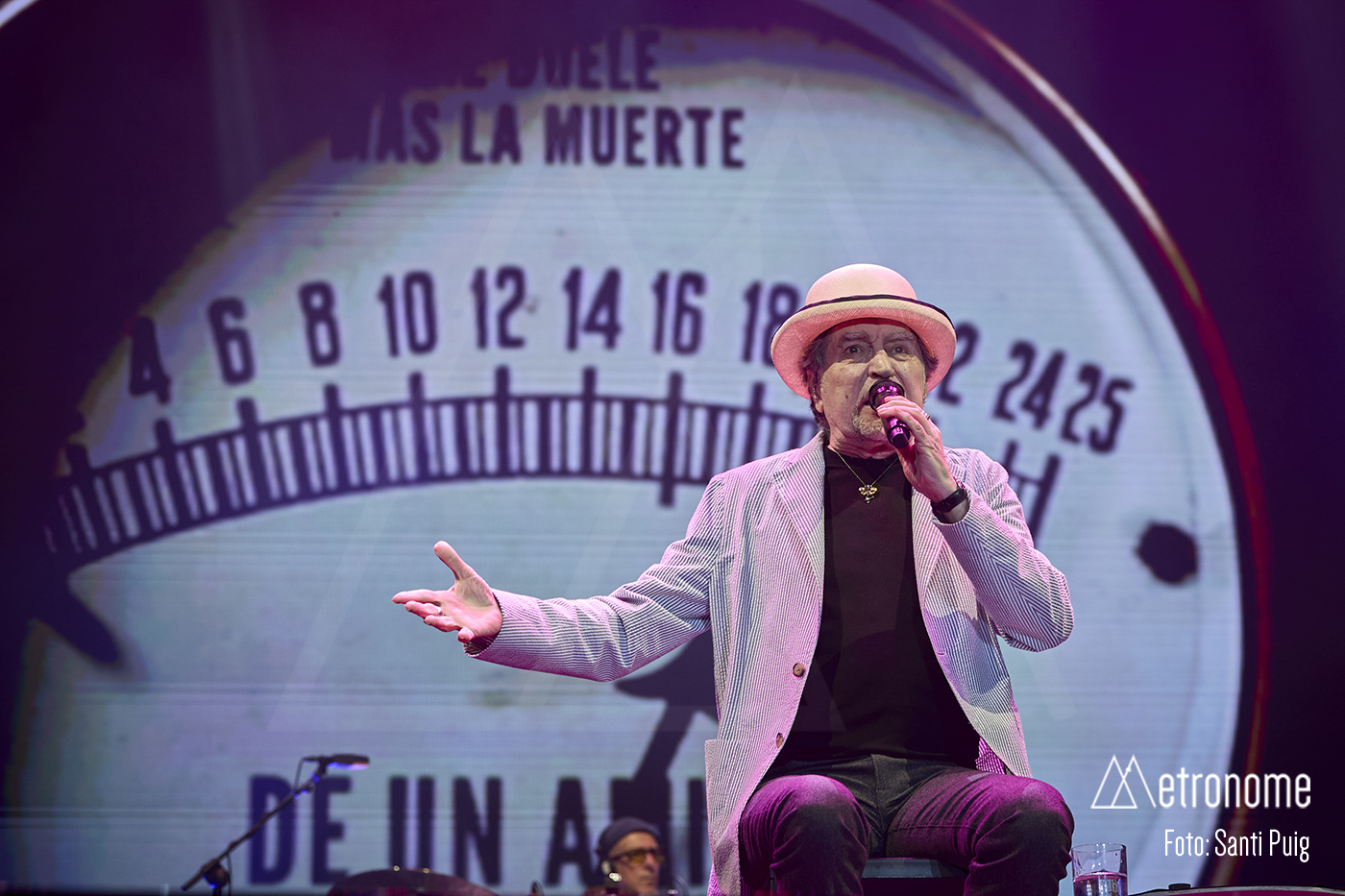 El primer descanso del artista llegó antes de cumplirse la hora de concierto porque el cuerpo manda y necesita recuperar fuerzas. Una ausencia que se prolongó durante dos temas que interpretaron Mara y Borja junto al resto de la banda. Regresó con bombín negro y camisa a juego para dar paso a una segunda parte donde se vivieron momentos más conmovedores como cuando, sentado junto a su corista en una mesa sencilla, interpretó “Una Canción para la Magdalena” que provocó una ovación unánime poniendo a su público en pie.