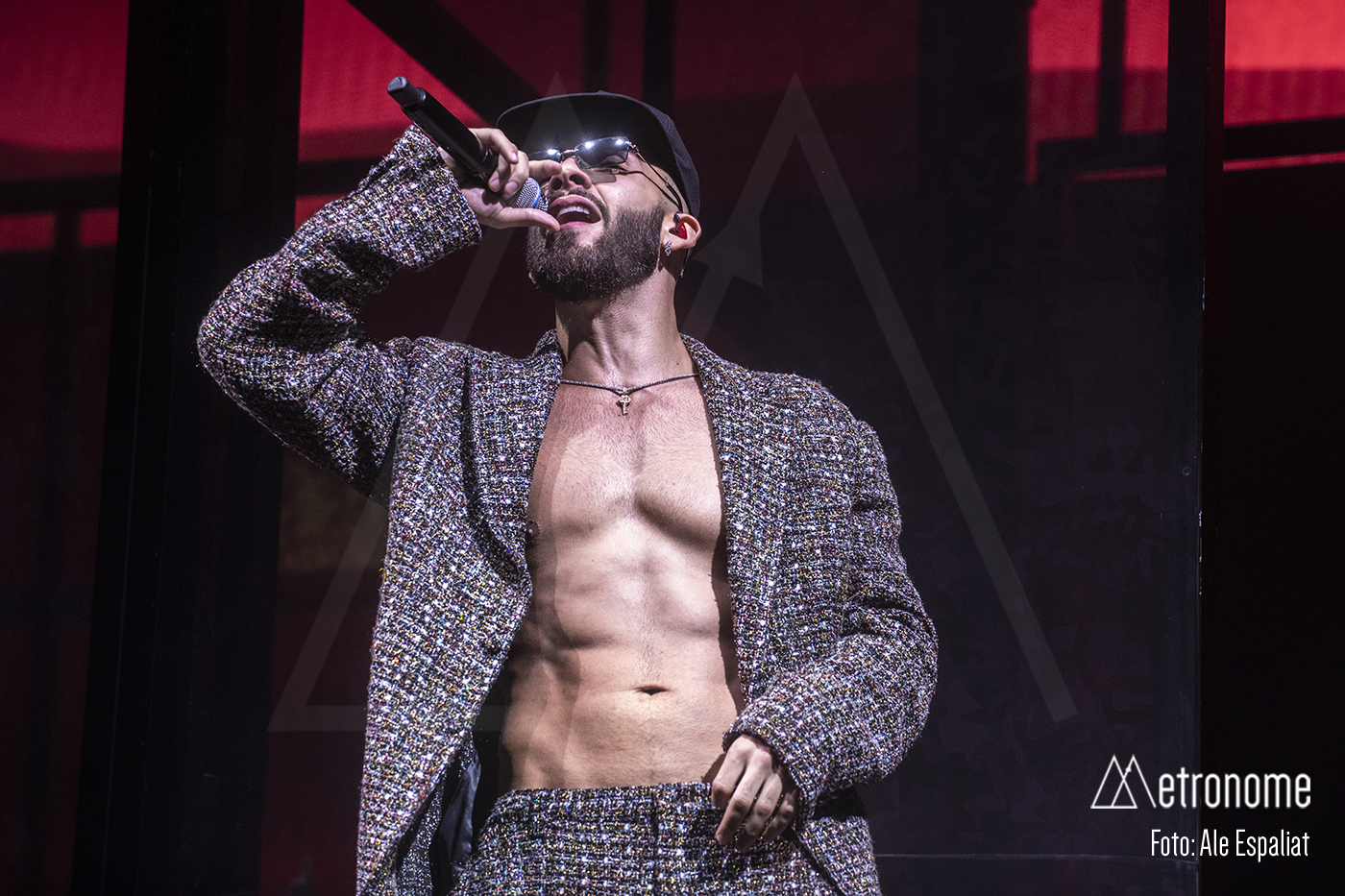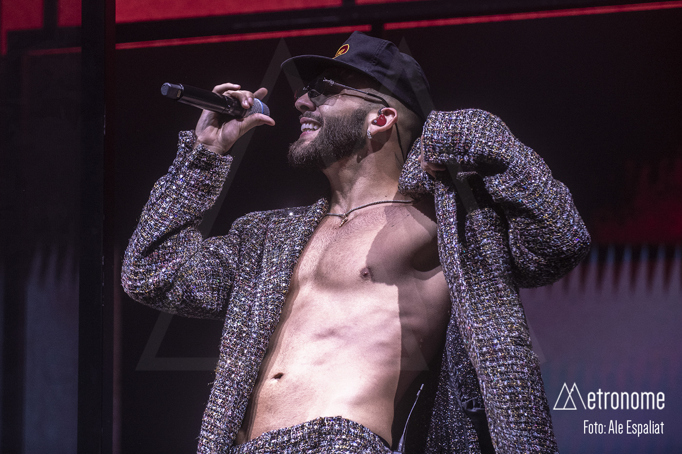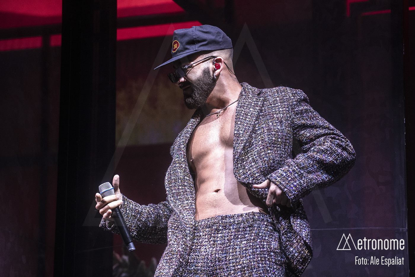 Finalmente, el momento tan esperado llegó. Las luces se apagaron y unos gritos inquietantes invadieron la sala. De repente, el escenario se iluminó con un destello y ahí estaba él: Manuel Turizo, vestido con un estilo urbano y una sonrisa que deslumbraba, con un traje de pedrería sin camiseta, para lucirse el tío! Claro que era lo único que pudo lucir esa noche. El público estalló en vítores y aplausos, creando un mar de gritos que resonó en todo el Sant Jordi Club.