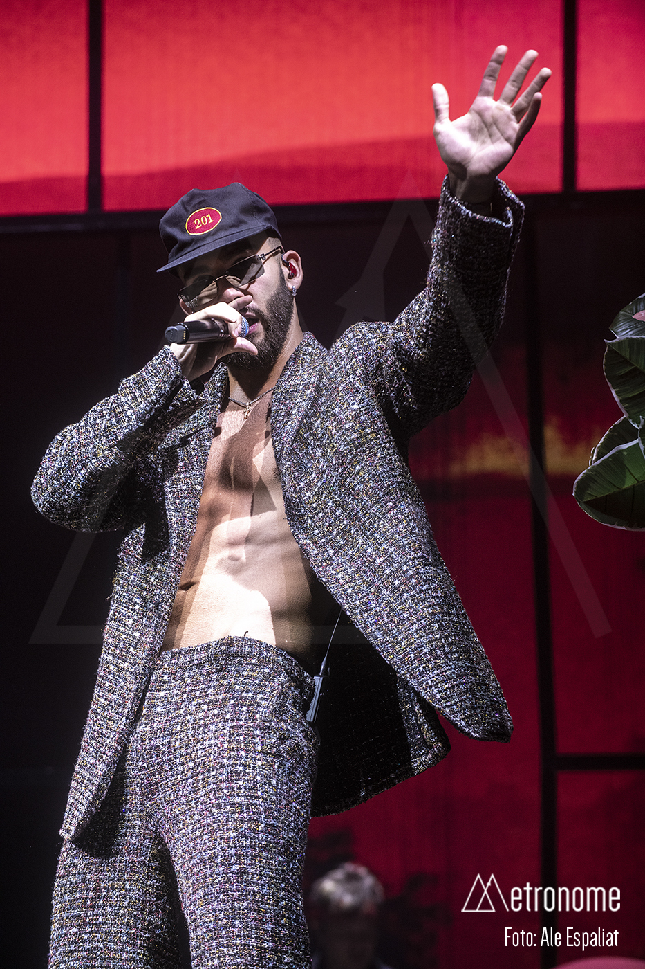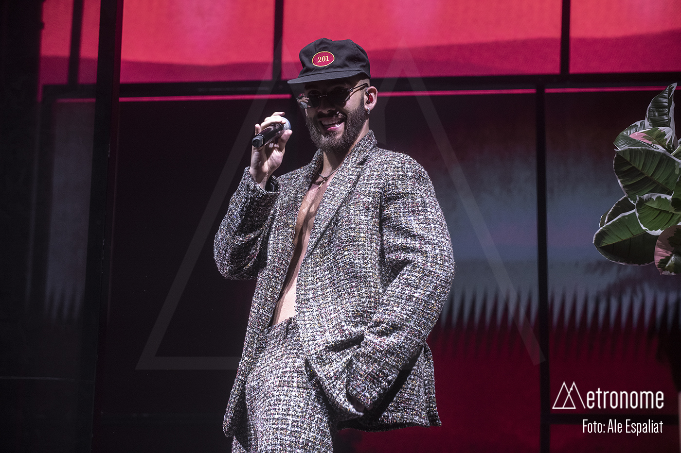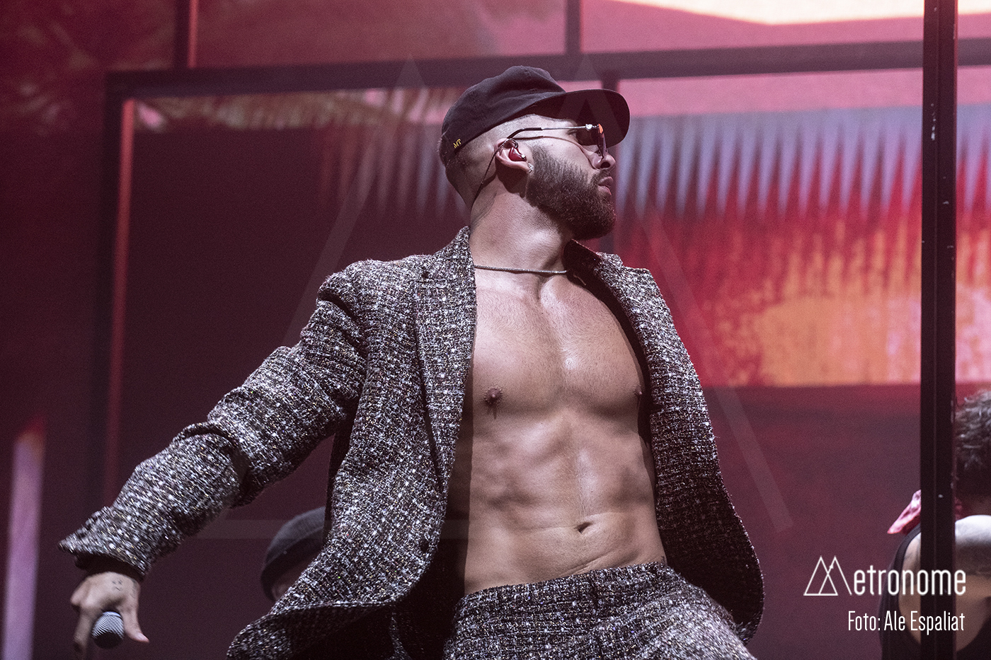 Finalmente, el momento tan esperado llegó. Las luces se apagaron y unos gritos inquietantes invadieron la sala. De repente, el escenario se iluminó con un destello y ahí estaba él: Manuel Turizo, vestido con un estilo urbano y una sonrisa que deslumbraba, con un traje de pedrería sin camiseta, para lucirse el tío! Claro que era lo único que pudo lucir esa noche. El público estalló en vítores y aplausos, creando un mar de gritos que resonó en todo el Sant Jordi Club.