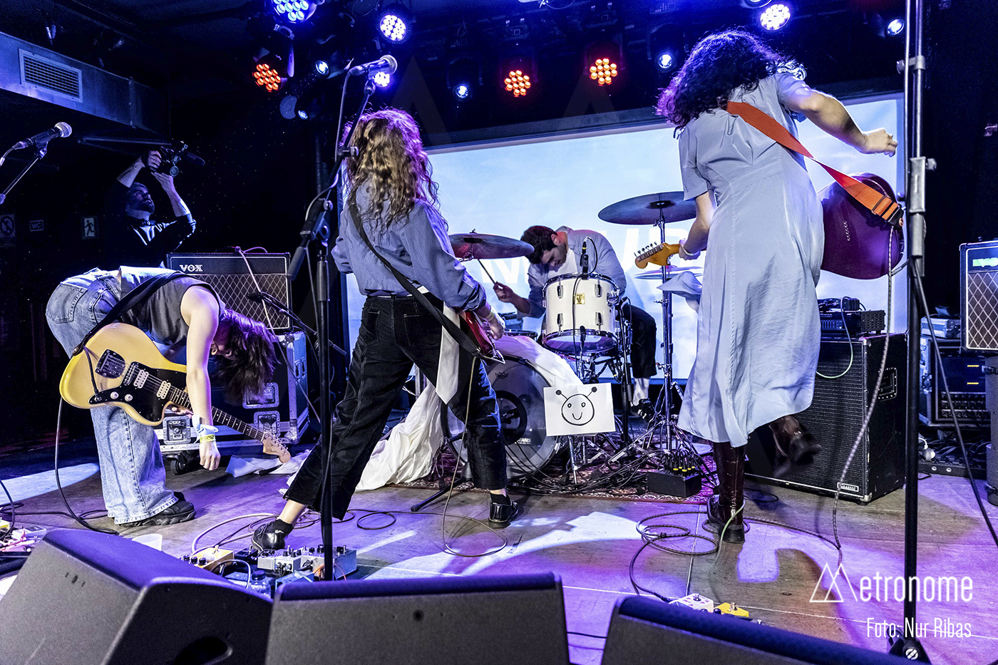 Pues bien, en el concierto del viernes, lamentablemente, estuvieron lejos de mostrarnos estas sonoridades renovadas en los nuevos temas. El concierto empezó con dos de los singles destacados del nuevo álbum, “Alegre y jovial” y “Verduras y Sentimientos”. Fueron intercalando otras canciones anteriores, como “Cold be Friends”, uno de los hits que subió las pulsaciones del público, “Call You Back” de melodía pegadiza, “Your Brain Is Made of Candy” o “Otitis”, dos de sus primeros temas que les dieron visibilidad. Pero nuestra percepción y decepción fue que todos los temas sonaban igual. Nos pareció un show poco trabajado, que emanaba nervios más que seguridad. Hasta la afinación de una guitarra se resistió, generando una larga espera que rompió el ritmo del concierto. Los asistentes eran en su mayoría, familiares y amigos que arropaban el progreso del concierto con aplausos moderados y silencios respetuosos entre temas.